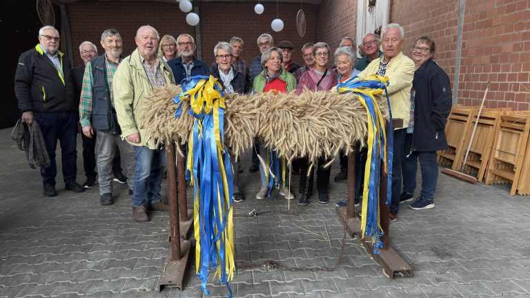 Am Montag hat der Heimatverein Dorf-Hervest den Erntekranz in der Scheune auf dem Hof Richter gebunden. Hier findet am 5. Oktober 2025 um 10.00 Uhr die Erntedankmesse statt.